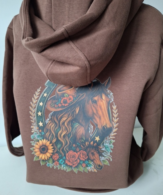 Na plecach znajduje się grafika przedstawiająca konia w otoczeniu jesiennych kwiatów i liści — symbol wolności, siły i spokoju, który towarzyszy każdej jeźdźczyni. Wysokiej jakości nadruk zachowuje kolory nawet po wielu praniach, a miękki, grubszy materiał zapewnia komfort w chłodniejsze dni.
